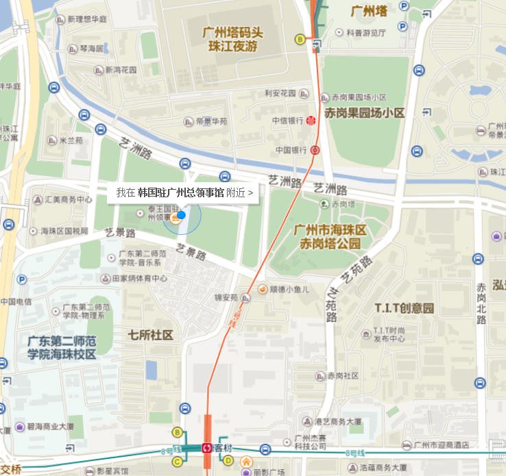 지하철 3호선 广州塔站 B출구로 나와서 艺苑路를 따라 200-300m오면 赤岗塔이 있음. 赤岗塔 앞에서 다시 우측 직각 방향으로 200-300m 정도의 거리이며, 지하철역에서 도보로 10분 정도 소요됨.
