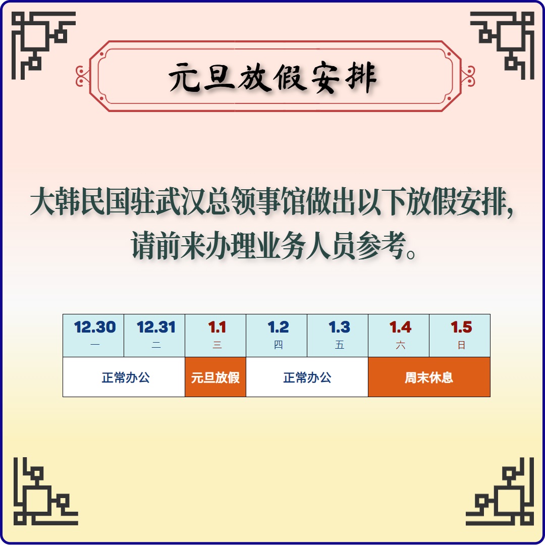 大韩民国驻武汉总领事馆做出以下放假安排,请前来办理业务人员参考。