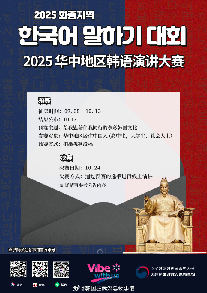 ※ 额外加分项 (微博参与话题互动:将演讲视频上传至个人微博账号,带话题#2025华中地区韩语演讲大赛#,并@韩国驻武汉总领事馆,同时将个人信息以及演讲主题私信发送至@韩国驻武汉总领事馆)